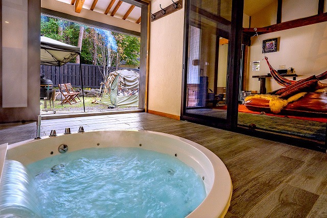 グランピングヴィラハンズ河口湖は、自然と大切な人との絆を改めて深めることのできる場所です。松林に囲まれ設備の整ったドーム型テントのパオ、ドアを開けると柔らかな日差しと心地よい風が吹き込むジャグジーと専用の中庭があるヴィラ。築100年以上の古民家、いたくら郷土館(増村邸)を新潟から移築再生したゲストハウスは、日本の昔ながらの囲炉裏とスタイリッシュなデザインのイタリアン家具に暖炉があり、和と洋が見事に融合し洗練された空間が広がっています。