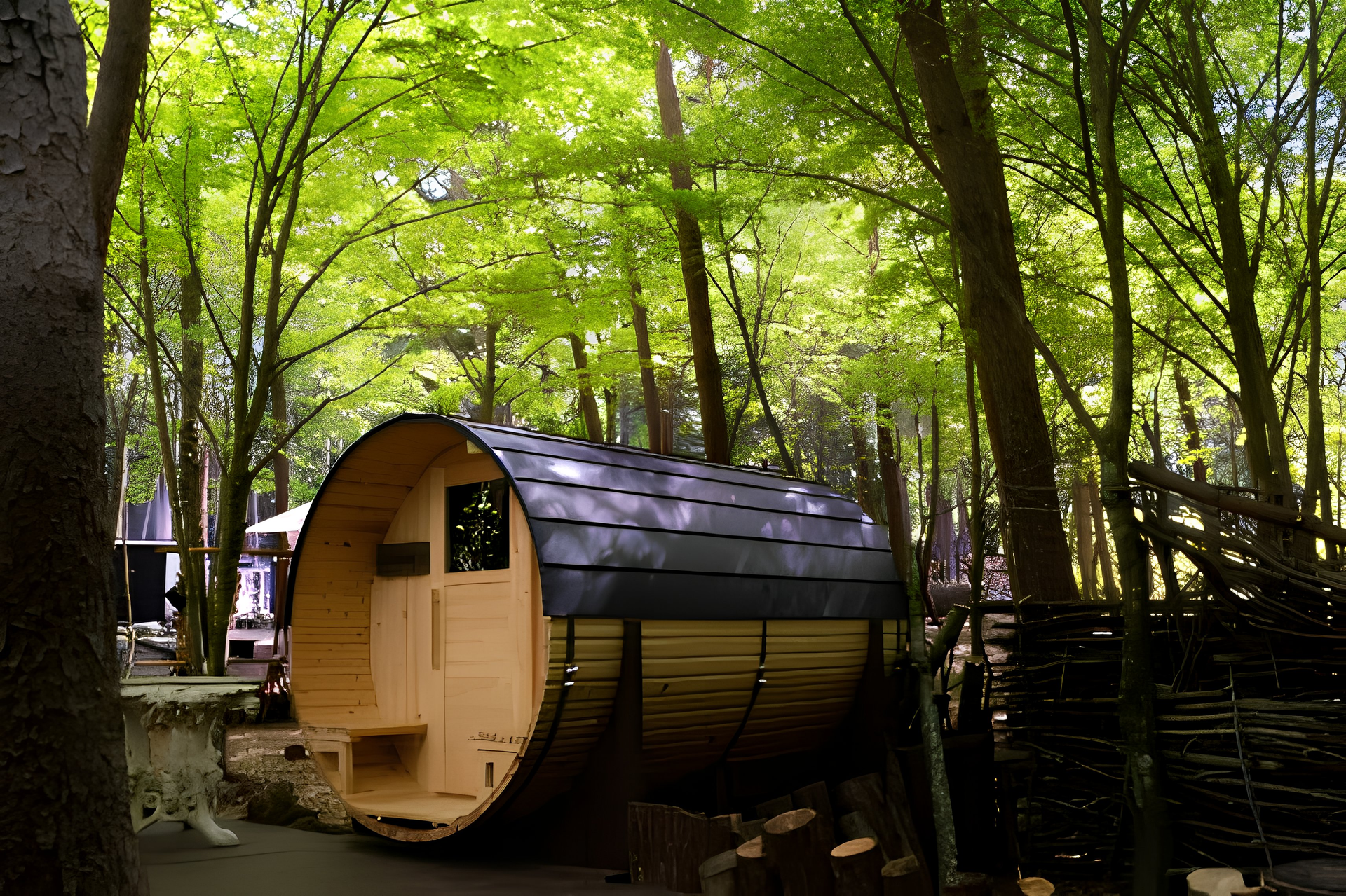 ヒノキ香るサウナ室でアロマウォーターを使用したロウリュ。新緑に囲まれながらの外気浴で究極のととのいを。