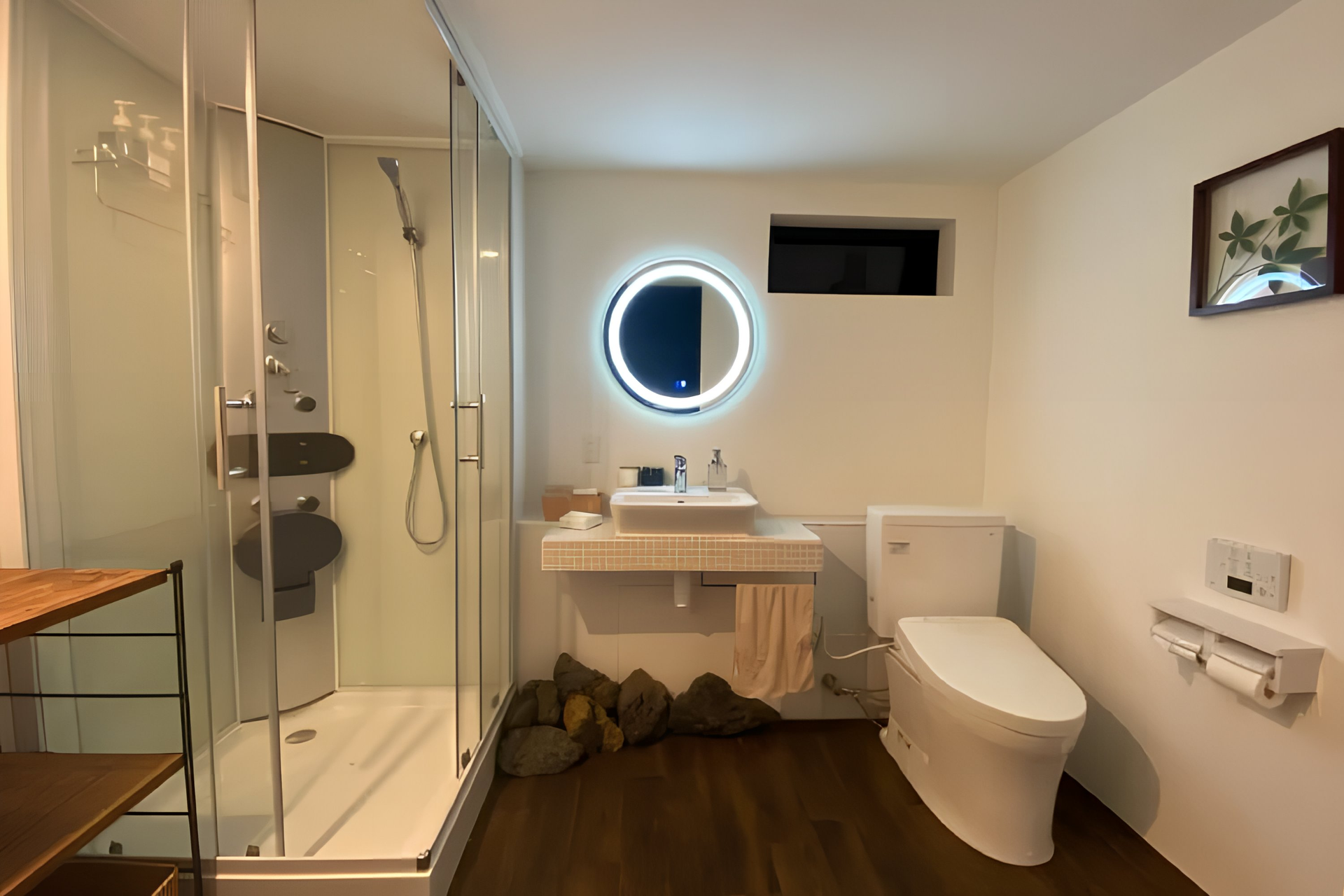 自然の中で遊んだ後に、自分たちだけの快適で清潔な空間でさっぱり。