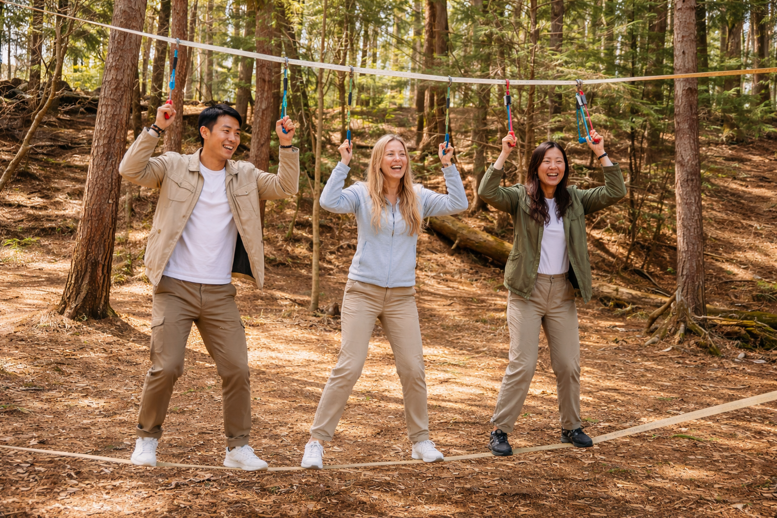 簡単に見えて意外と難しい、渡りきれるようになるまで大人もつい夢中になるアウトドアスポーツを森の中で。